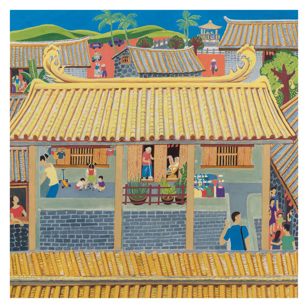 “本次展出中的19件海南農(nóng)民畫年畫作品題材廣泛,形式多樣,用鮮明熱烈的色彩描繪了海南人民生活的幸福畫卷,抒發(fā)了對自貿(mào)港建設(shè)的美好憧憬。這是本地勞動人民從生活中脫穎而出的民間美術(shù)的再創(chuàng)造,作品以海南風(fēng)土人情為主要題材,以豐富的海南地區(qū)民俗情態(tài)、外拙內(nèi)巧的藝術(shù)風(fēng)格為特點?!焙D鲜∶佬g(shù)家協(xié)會副主席兼秘書長王銳介紹,比如海南作者王娟的《瓊北人家》勾畫出了海南新農(nóng)村農(nóng)民住進(jìn)新屋,其樂融融、安居樂業(yè)的幸福情景;吳坤友創(chuàng)作的《福山晨曲》以大圓套小圓的藝術(shù)表現(xiàn)形式,生動地表達(dá)了農(nóng)民豐收的喜悅,迎面而來的拖拉機正是海南自貿(mào)港努力奮發(fā)精神的體現(xiàn)。