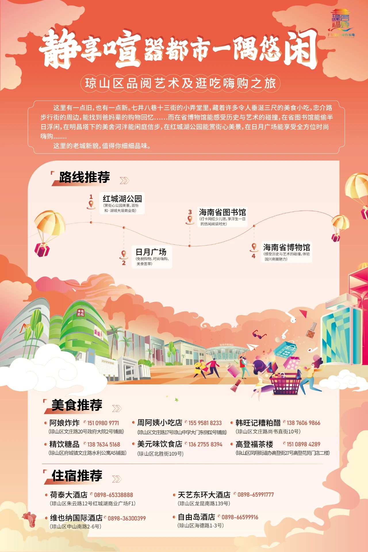 石山生態美食街(靠山吃山的火山美食)——保利中央海岸國際餐飲文化商業街區(詩意場景中創造“煙火氣”)——遠大購物廣場(品類眾多的餐飲美食店)——尋嘗里夜市(各種美食,應有盡有)/假日海灘(自助燒烤園)