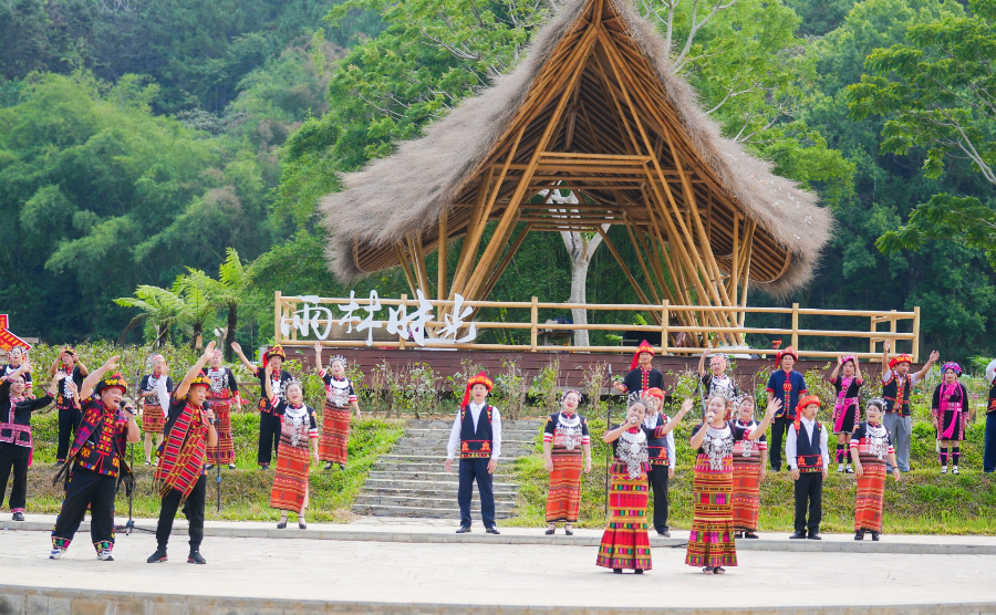 在雨林時光廣場,這里正進行黎族民歌竹筏對唱。在青山綠水間,阿哥阿妹撐著竹筏對歌,讓游客沉浸式體驗黎族傳統音樂魅力。