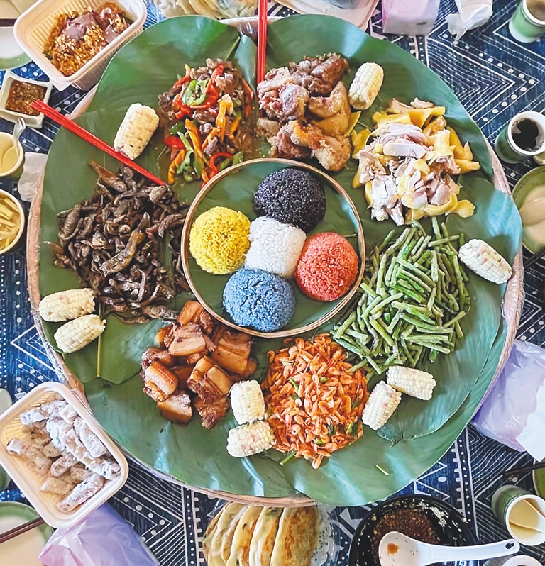 苗家簸箕餐,包含了香煎五腳豬肉、五色飯、苗家船型粽等美食。海南日?qǐng)?bào)記者 謝凱 攝