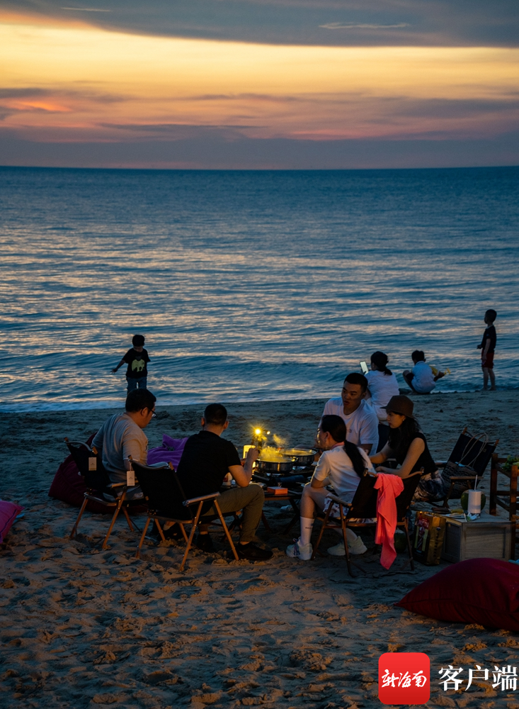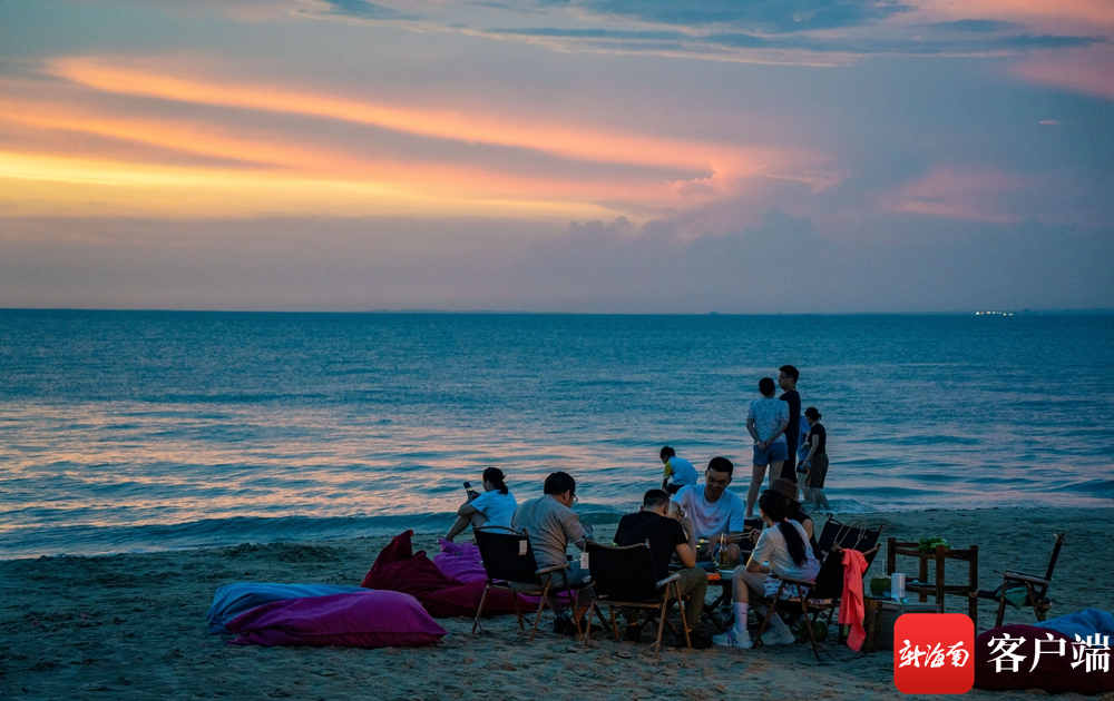 新海南客戶端、南海網(wǎng)、南國都市報5月26日消息(記者 劉孫謀)5月26日下午6時,在海口市棲海岸露營基地,一場降雨過后,海口出現(xiàn)美麗的晚霞,金色的陽光灑在沙灘上,吸引了許多市民前來游玩拍照,有不少市民在沙灘上戲水,還有市民在此一邊喝椰子水一邊打邊爐,美景美食相伴,好生愜意。