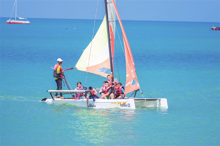 近日,在天涯海角游覽區,參加研學游的小朋友體驗帆船運動。三亞日報記者 陳聰聰 通訊員 黃丁丁 攝