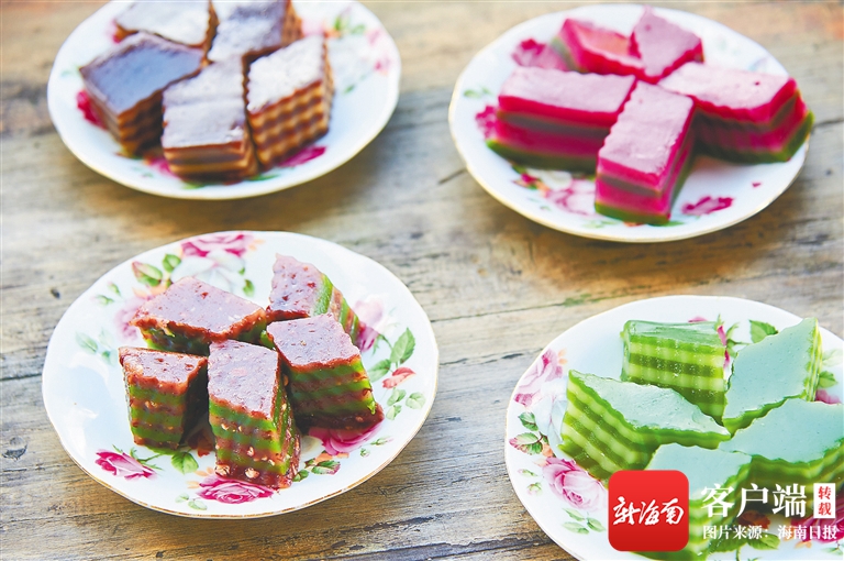 如今,隨著食品加工業的發展,許多粉面、小吃都可以在商超里買到,但仍有一些海南人堅持純手工“做吃”。每年春節前夕,文昌市會文鎮鳳會村村民符京和妻子林亞良都會做一批糖貢作為年貨。進入臘月后,他們提前準備糯米、花生、椰絲等原料,用鐵鍋翻炒花生碎、芝麻、糖漿等,然后將半成品裝入正方形的木容器中,壓平切塊。