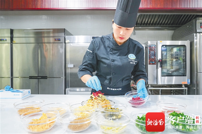 海口旅游職業學校給烹飪專業二年級的學生開設了實操課程“海南特色小吃”,制作海南粉是這套實操課程的第一課。老師手把手教學生選材、炒鹵、拌粉的同時,也告訴他們每個環節有哪些講究。
