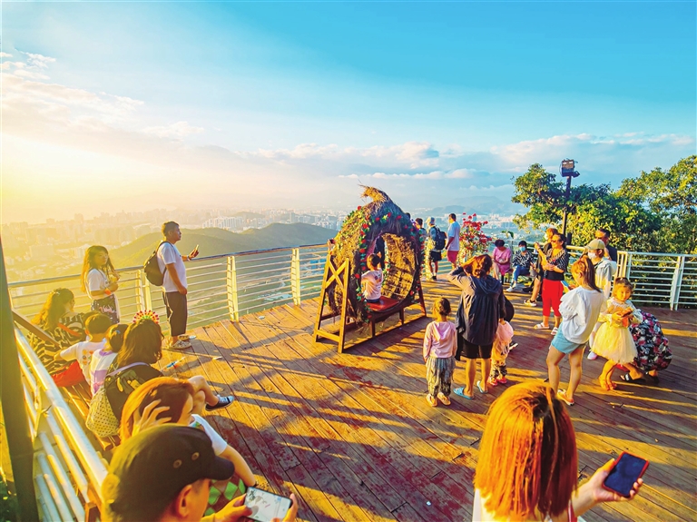 游客在三亞鳳凰嶺海誓山盟景區(qū)觀看日落。