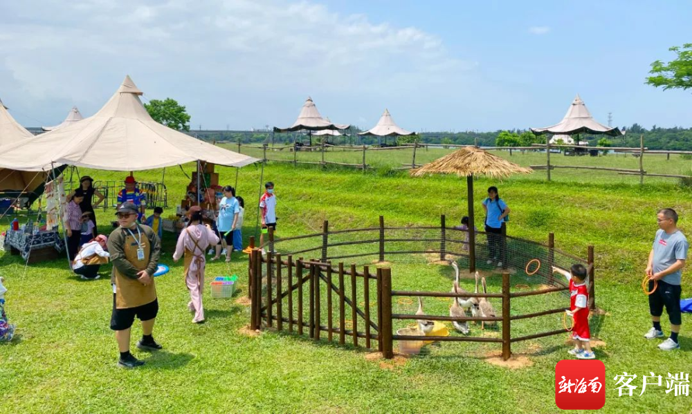 海口市郊黑山村外、南渡江畔,一塊延伸到江心的芳草沙洲,就是海口最先火起來(lái)的露營(yíng)基地之一——北姆堆公園。這里有滿目嫩綠的草地,一頂頂天幕帳篷分布其間,供游客直接使用。這里也提供設(shè)備租賃,游客可以自行搭建。人們支起小桌子,鋪上野餐墊,彈琴、唱歌、拍照、享受美食,或是組隊(duì)玩飛盤、放風(fēng)箏,好不自在;“兔子島”“柯爾鴨萌寵”等項(xiàng)目的加入,更讓北姆堆成為近郊親子游的人氣之選……