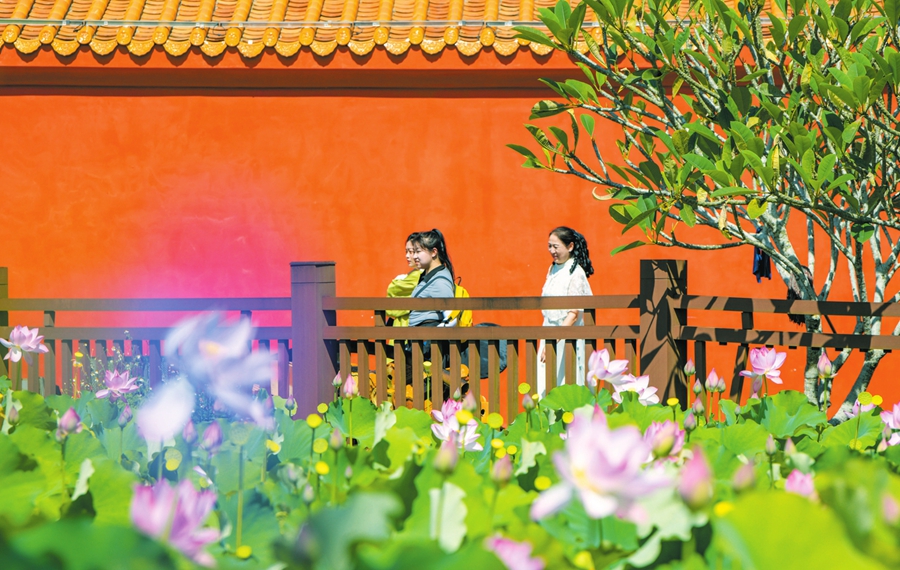 市民游客在美蘭區(qū)芳園國(guó)際藝術(shù)村棧道賞荷。海口日?qǐng)?bào)融媒體記者 康登淋 攝